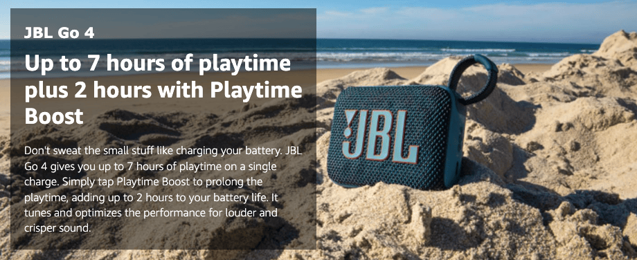 - Up to 7 hours of playtime plus 2 hours with Playtime Boost: Don’t sweat the small stuff like charging your battery. JBL Go 4 gives you up to 7 hours of playtime on a single charge. Tap Playtime Boost to add up to 2 more hours to your battery life.