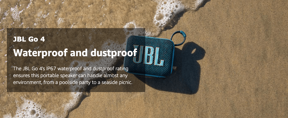 - Waterproof and dustproof: The JBL Go 4’s IP67 waterproof and dustproof rating ensures this portable speaker can handle almost any environment, from a poolside party to a seaside picnic.