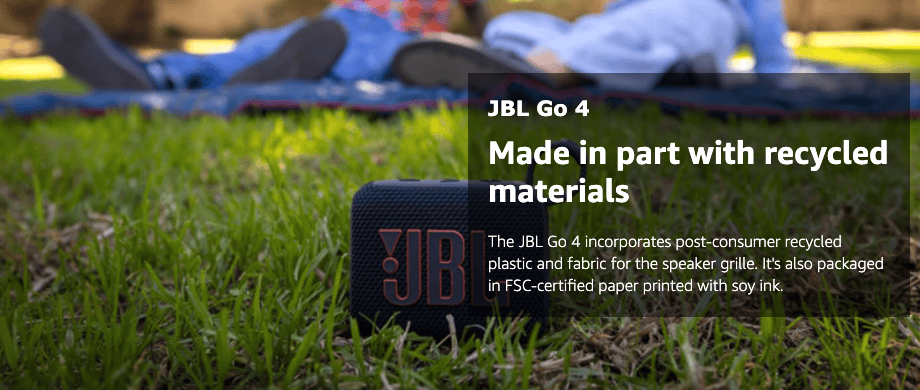 - Made in part with recycled materials: The JBL Go 4 incorporates post-consumer recycled plastic and fabric for the speaker grille. It’s also packaged in FSC-certified paper printed with soy ink.